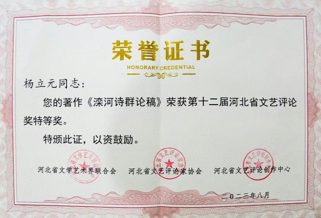 近日,beat365文学院杨立元教授的评论专著《滦河诗群论稿》获第十四届河北省文艺振兴奖。河北省文艺振兴奖是河北省委、省政府设立的文艺类省级奖,旨在表彰在文艺创作、演出、评论、研究等方面取得突出成绩的文艺工作者和团体,目前该奖项每五年评选一次。自“文艺振兴奖”设立以来,对河北文艺创作的繁荣发展和文艺人才的发现培养产生了积极推动作用。这是杨立元教授第三次获得此奖项。