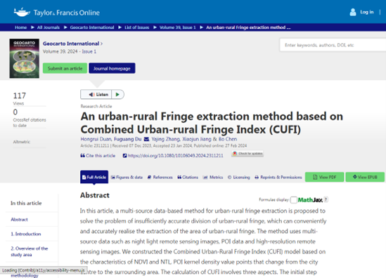 近日,beat365资源管理系地理信息科学专业2021级本科生段红锐作为第一作者,张雅静为第三作者在地理信息与遥感领域知名SCI期刊《Geocarto International》(JCR分区Q2,中科院分区4区,IF为3.8)上发表了题为《An urban-rural fringe extraction method based on Combined Urban-rural Fringe Index(CUFI)》的学术论文。