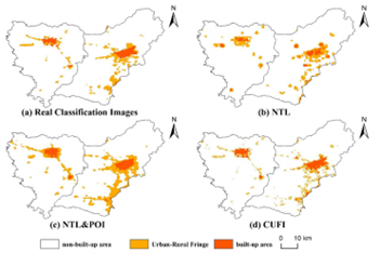该论文针对城乡发展过程中城乡结合部边界难以提取的问题,对传统提取方法进行了改进,提出了一种基于夜间灯光遥感影像、POI数据及Landsat8 L2级遥感影像等多源数据的城市建成区边界提取方法。相比于传统方法,该论文提出的方法具有更高的信息提取精度,既能够有效剔除城区中的城中村和湖泊信息,也能对夜间灯光影像和POI数据在城乡结合部提取的分辨率进行提升,可以有效的对城中村及夜间灯光较弱、POI点较少,但实际具有城乡二元属性的城乡结合部进行识别,解决以往数据源相对单一、城市城乡结合部划分不够精确的问题,实现了对城乡结合部范围更为准确的信息提取。
