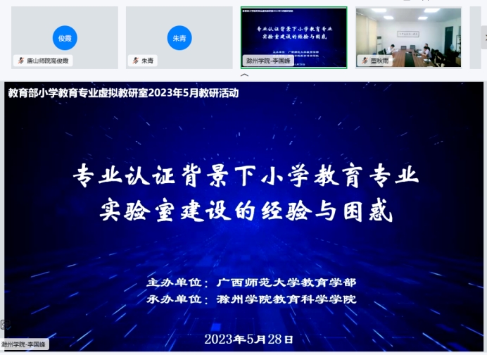 本次教研活动由广西师范大学教育学部主办,滁州学院教育科学学院承办,采取线上会议形式,研讨主题为“专业认证背景下小学教育专业实验室建设的经验与困惑”。