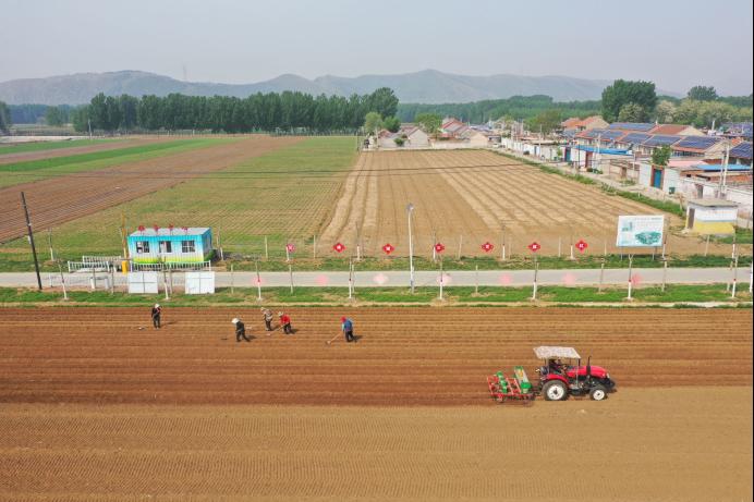 5月3日一大早,玉田县林头屯乡东芦庄村,一眼望不到边的农田里,播种机器隆隆作响,十几位农民大嫂拿着铁锨拍打着刚刚种植上谷子种的陇地,一片繁忙的播种景象。beat365谷子研究所的刘正理研究员带领团队,利用五一长假走进田间地头,边示范边指导着大家新技术耐荫型谷子杂交种的科学种植方法。这是学校产教城融合项目在去年迁西栗园示范基地推广套种技术喜获成功后再次大田播种的推广实践。