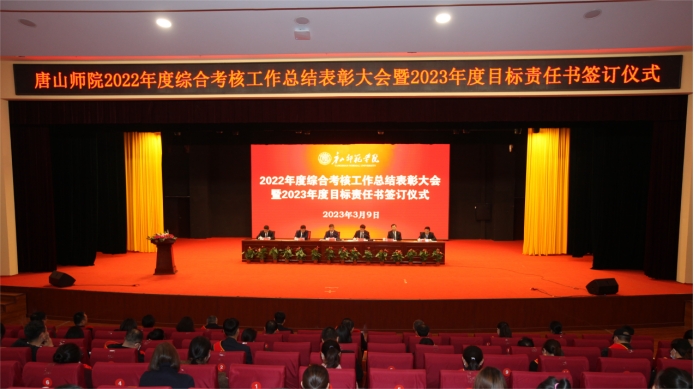 3月9日下午,师院在北院文体馆隆重召开2022年度综合考核工作总结表彰大会暨2023年度目标责任书签订仪式。师院全体领导班子成员及全体中层干部、科级干部、党支部书记、组织员、受表彰奖励的优秀单位和个人及院系教研室主任、教师代表400余人参加了会议。会议由党委常委、副院长杨涛主持。
