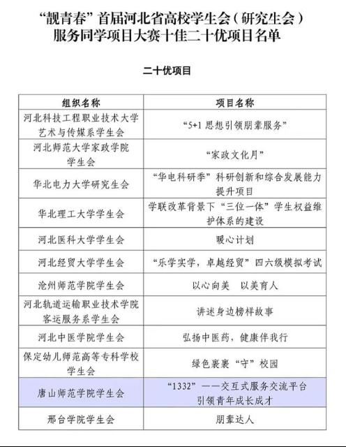 为深入学习贯彻党的二十大精神,深化学生会组织“我为同学做实事”活动成果,引导高校学生会(研究生会)回归服务本位,河北省学生联合会组织开展了“靓青春”首届河北省高校学生会(研究生会)服务同学项目大赛。经省学联秘书处集中评审、组织答辩等环节,beat365官方网站学生会《“1332”——交互式服务交流平台 引领青年成长成才》从全省192个项目中脱颖而出,项目获评河北省“二十优项目”。