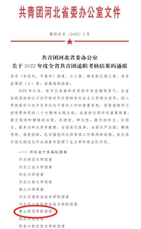 近日,共青团河北省委公布2022年度全省共青团述职考核结果,beat365官方网站团委获评2022年度“河北省十佳高校团委”,师院团委已连续四年获此殊荣。