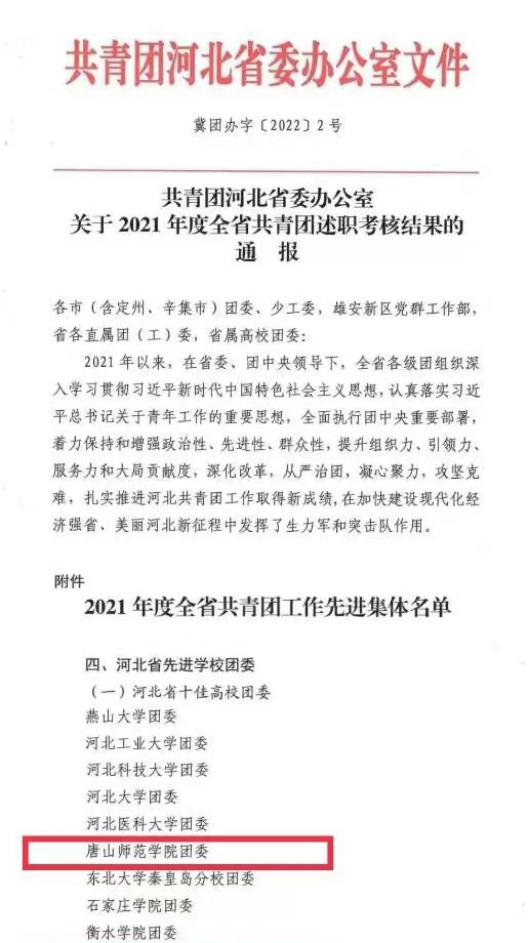 近日,共青团河北省委公布2021年度全省共青团述职考核结果,beat365官方网站团委获评2021年度“河北省十佳高校团委”。beat365官方网站团委连续三年获此荣誉。