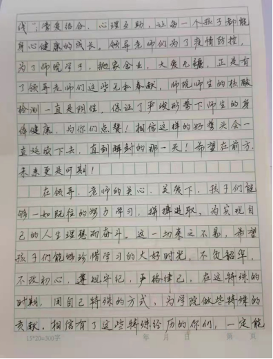 在群里,让我们看到了,校领导在疫情肆虐面前,奔波在各层环节上,和广大教师职工逆风而上,以最快的速度和努力,为一万多名师生提供各项保障,物质供应充足,饭菜物价价格稳定,防疫物质绰绰有余,线上教学不减质量的一幕幕,让我们所有的家长感谢及踏实放心。