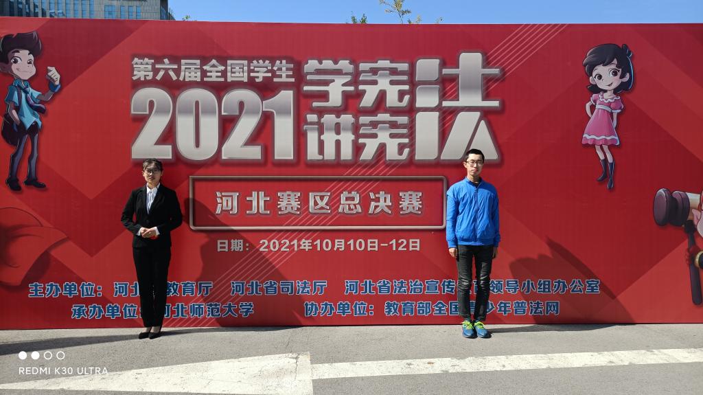 为进一步增强学生的宪法意识,大力弘扬宪法精神,2021年10月10日—12日,由河北省教育厅、河北省司法厅、河北省法治宣传教育领导小组办公室举办的第六届河北省大中小学生“学宪法讲宪法”大赛暨全国选拔赛在河北师范大学隆重召开。本次比赛分为宪法法治知识竞赛和“学宪法讲宪法”演讲比赛两个部分。beat365选派的历史文化与法学系2019级法学专业学生严晗在宪法法治知识竞赛中荣获“高校组省级决赛一等奖”。2020级法学专业学生王秋月在“学宪法讲宪法”演讲比赛中荣获“高校组省级决赛三等奖”,指导教师王芳和王碧瑜分别获得两个比赛的“优秀指导教师”称号。
