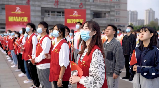 “五星红旗迎风飘扬,胜利歌声多么嘹亮……”熟悉的旋律响起,现场近千名团员青年高声齐唱《歌唱祖国》。青年们挥舞着手中的国旗,共同祝福祖国走向繁荣富强。