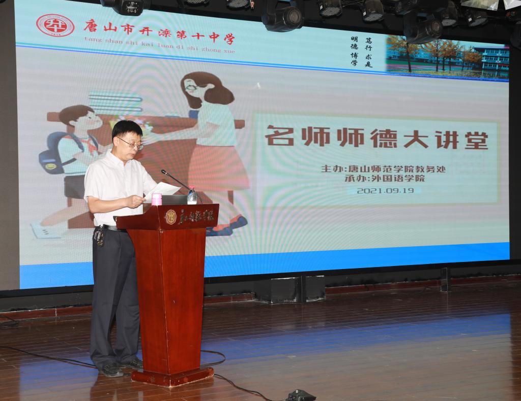 为提升beat365师范生培养质量,助力唐山市基础教育事业高质量发展,2021年9月19日下午,beat365在大学道南院会议中心举办了名师师德大讲堂活动。此次活动由学校教务处主办,外国语学院承办,邀请了唐山市开滦十中校长张冬梅作报告。副校长杨涛、教务处处长王淑娟、学生处处长刘金玲、外国语学院院长邓晓峰出席了活动,各院系公费师范生代表和部分师范生代表参加了活动。活动由副院长杨涛主持。