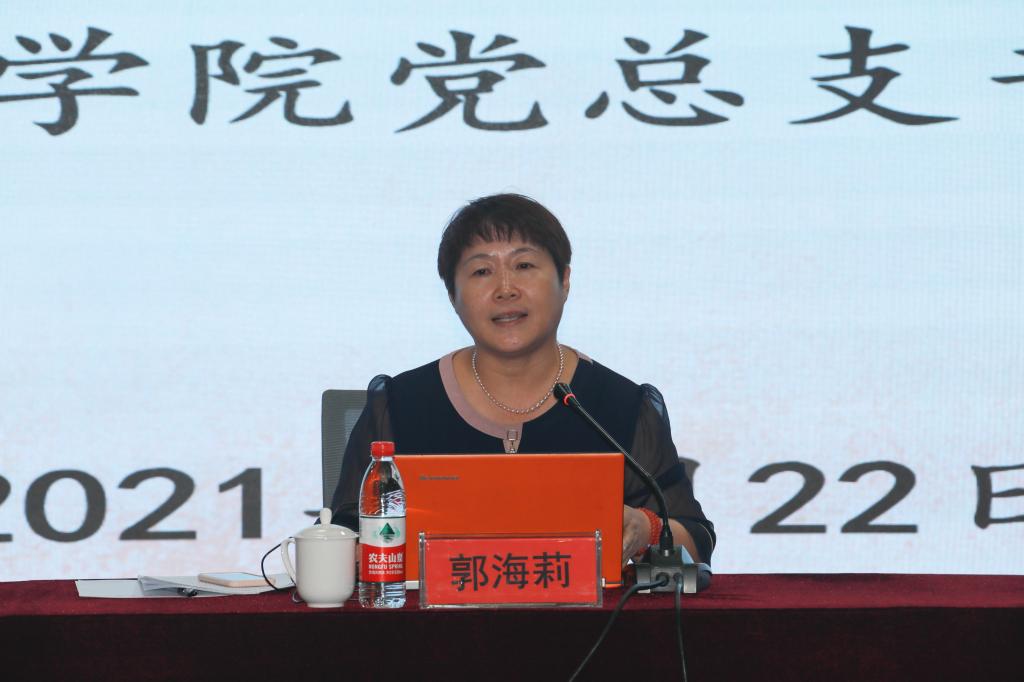马克思主义学院党总支书记郭海莉以《感怀领袖风范 感悟思想伟力》为题作学习习近平总书记“七一”重要讲话精神专题报告。她从“深入把握中国共产党初心和使命昭示的不变主题”“深入把握百年奋斗的主题和伟大成就与全面建成社会主义现代化强国的根本要求”和“深入把握习近平总书记“七一”重要讲话的新思想新观点新要求”三个方面进行分享与阐述。
