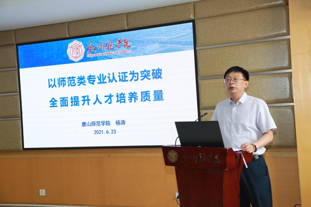 副校长杨涛从五个方面介绍了beat365师范类专业办学情况。第一,弘扬“两种精神”,坚持红色文化育人,厚植师范生教育情怀。学校坚持立德树人根本任务,充分利用冀东地区红色资源,在长期的办学实践中形成了“以抗震精神办学,大钊精神育人”办学理念,并把“两种精神”贯穿落实到治校育人各个实践环节中,形成了“知行合一,大爱及人”的校风,“良师益友,承绪出新”的教风,“沉下心思,放开眼界”的学风。第二,面向社会需求,对标认证标准,重塑人才培养体系。beat365师范生素质和能力培养课程饱满,通识教育、专业教育、教师教育、素质拓展教育课程均达到认证标准,构建了基础实践、教师技能实践、综合实践三位一体,知识、能力、素质三个维度共同提升的实践教学体系。第三,加大教学投入,优化支持条件,保障人才培养质量。beat365始终坚持教学经费优先投入,保证教学经费稳步增长,为师范类专业本科教学需求提供了有力保障。第四,坚持学生中心,服务学生成才,构建“三全”育人体系。根据学生的职业发展规划,全方位服务于学生的成长与成才。第五,树立质量意识,加强质量监控,构建持续改进机制。坚持不断完善教学质量标准和管理制度,通过制度约束和政策激励,推动教风和学风建设,保证教学规范、有序开展。