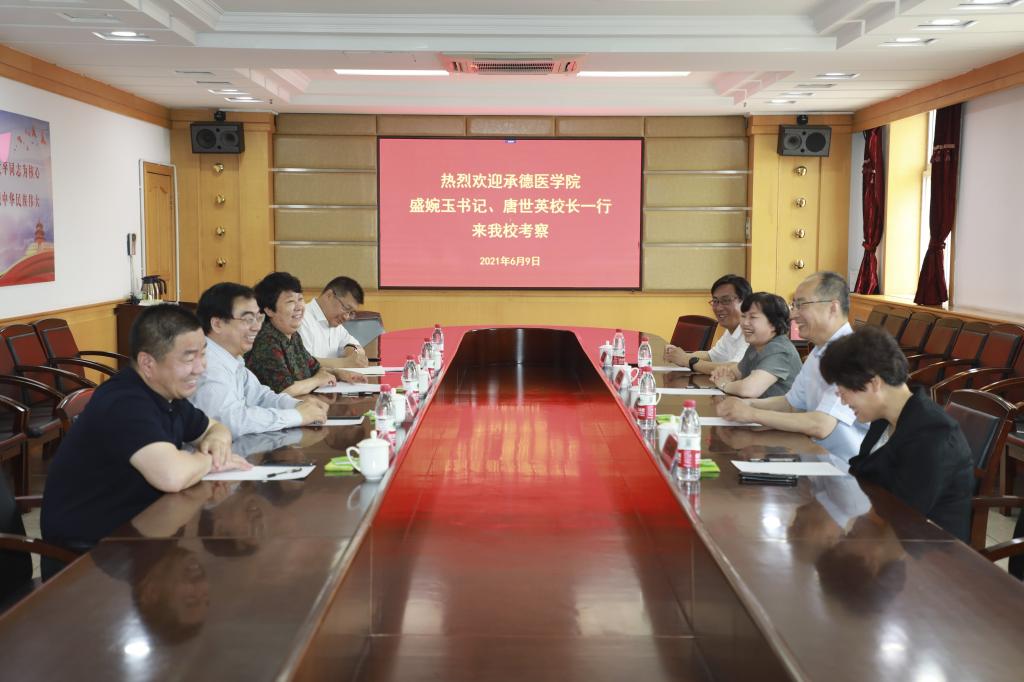 2021年6月9日上午,承德医学院党委书记盛婉玉、院长唐世英、副校长张凯一行来beat365考察交流,学校党委书记王英、校长杜彩芹、副校长安文忠会见了盛书记一行。