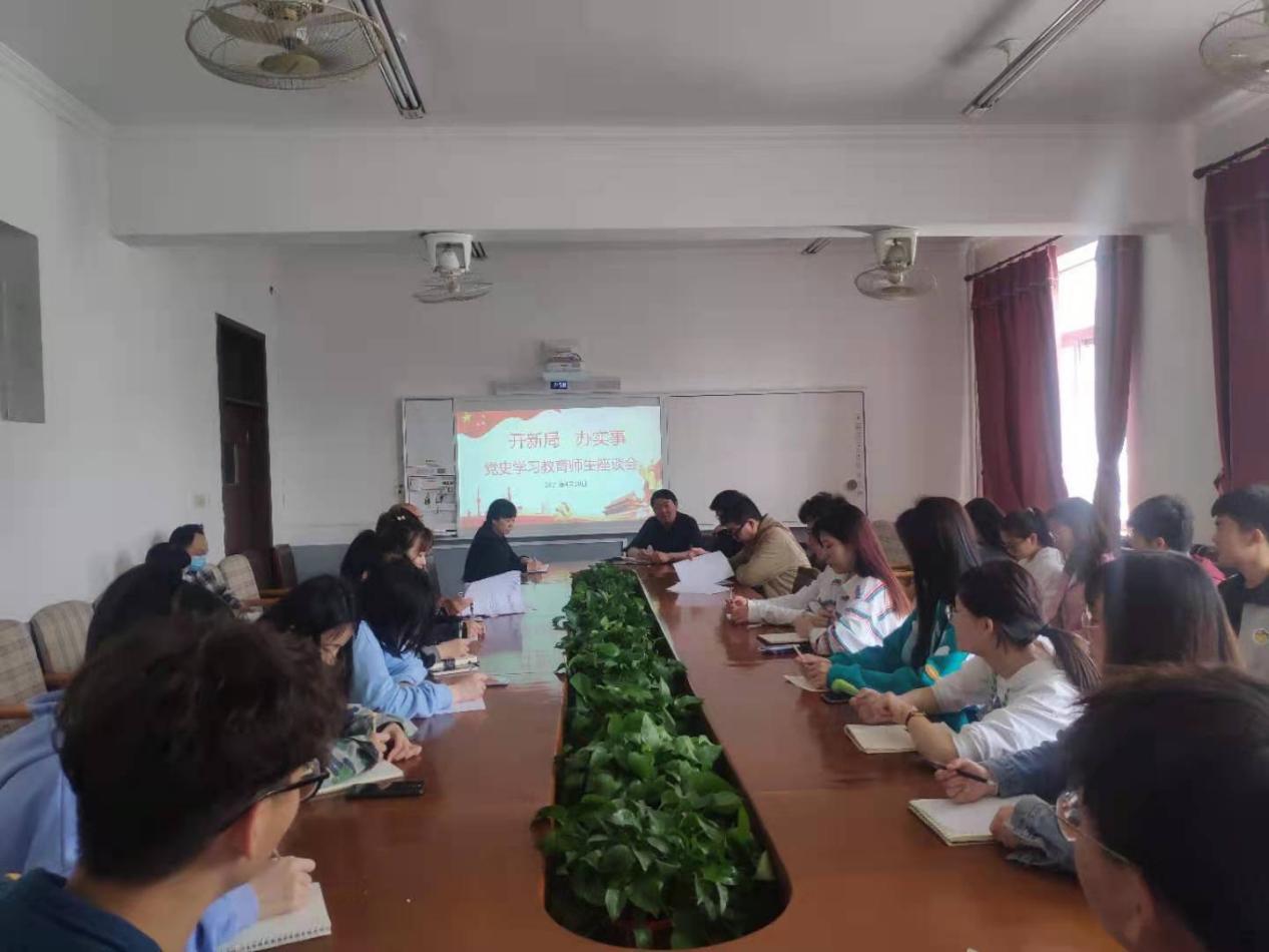 2021年4月20日下午三点,教育学院在二层会议室召开“开新局 办实事”党史学习教育师生座谈会。座谈会由教育学院分党委书记陈克良同志主持,副书记张颖琳、副院长高俊霞、副院长王建国及师生代表参加了座谈。