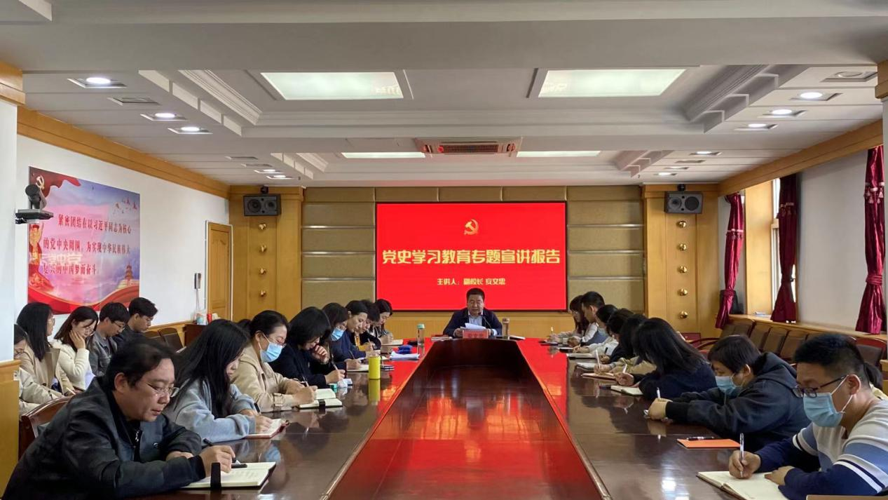 为认真贯彻落实习近平总书记在党史学习教育动员大会上的重要讲话精神,扎实开展党史学习教育,按照上级和学校的统一部署,4月14日下午,副校长安文忠在主楼五层会议室做党史学习教育专题宣讲报告。物理科学与技术学院、音乐系、学生处、团委、财务处和后勤基建处的党员和教师代表参加了学习教育。