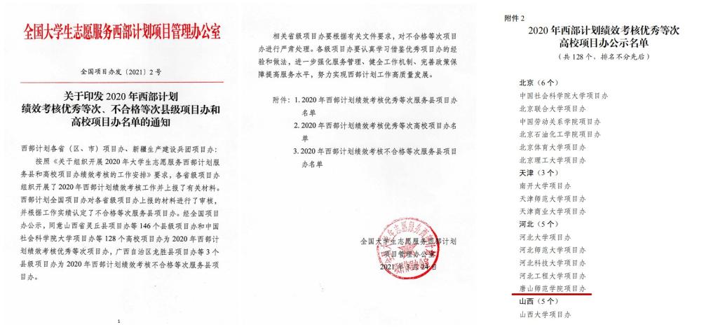 近日,全国大学生志愿服务西部计划项目管理办公室发布了《关于印发2020年西部计划绩效考核优秀等次、不合格等次县级项目办和高校项目办名单的通知》(全国项目办发〔2021〕2号)。经省级项目办考核上报、全国项目办评审和公示,beat365项目办获评“2020年全国西部计划绩效考核优秀等次高校项目办”称号(省内共有5所高校获此殊荣),这是beat365连续四年获此荣誉。