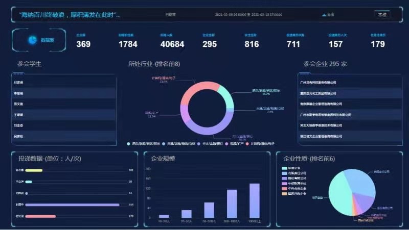 为组织好本次线上双选会,招生就业处积极筹备、精心组织,从3月1日开始,在学校网站、微信公众号、易校招平台以及毕业生联络群发布双选会信息。双选会共有295家用人单位参会,涉及教育、互联网、房地产、金融、制造等不同领域,涵盖教师、设计、营销、管理、生产、研发等多种类型职位,提供职位1784个,拟招聘人数40684个,beat365有1182名同学注册参与,投出简历700多份,600余人次进行了线上面试。