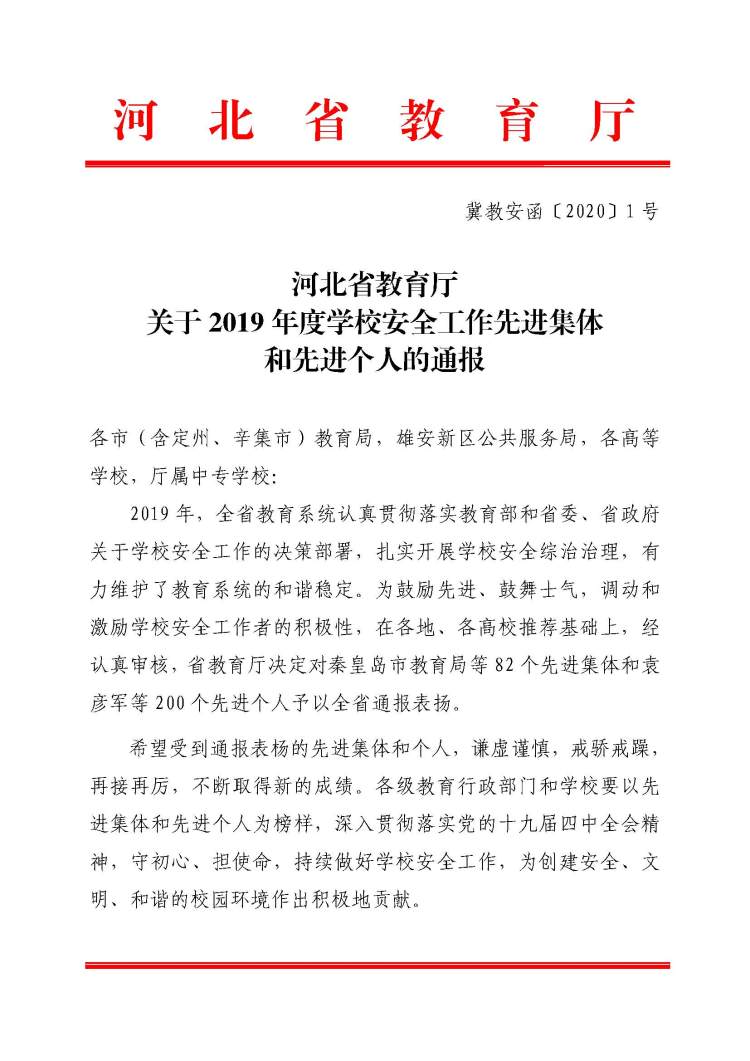 近日,beat365被河北省教育厅评为“2019 年度学校安全工作先进集体”。