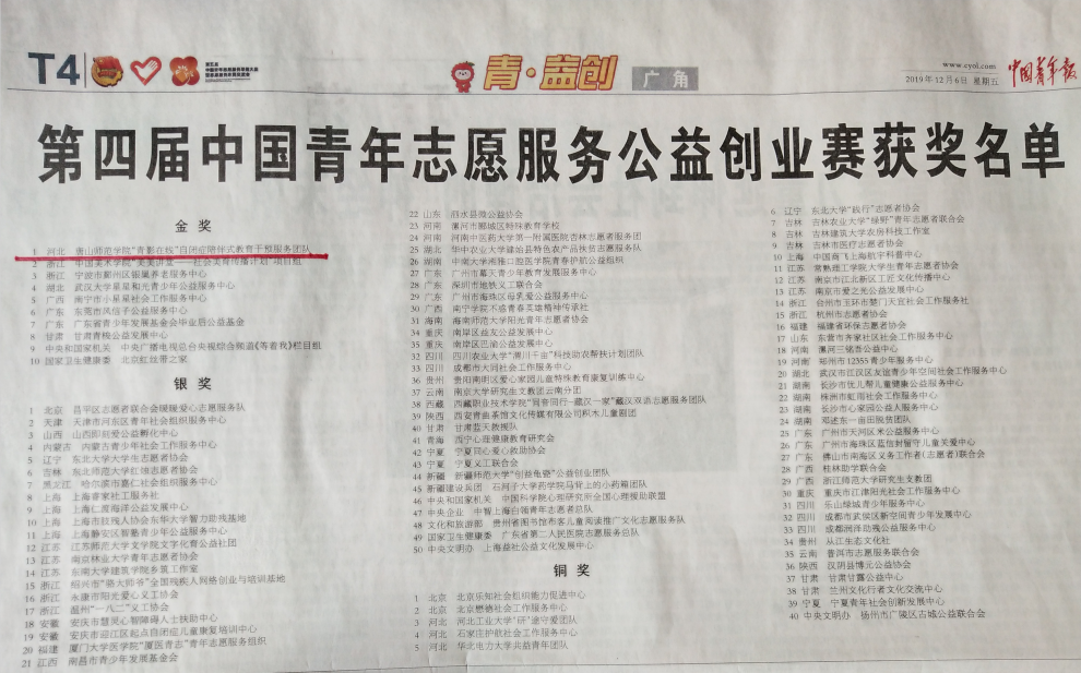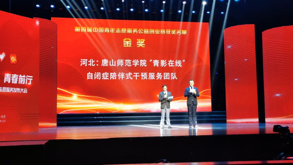 12月2日,由共青团中央、中央文明办、民政部、水利部、文化和旅游部、国家卫健委、中国残联和中共广东省委、广东省人民政府共同举办的2019年志愿服务交流会暨第四届中国青年志愿服务公益创业大赛在广东东莞举行。beat365青年志愿服务品牌项目《“青影在线”——自闭症陪伴式教育干预服务》经过激烈的角逐,以全国总成绩排名第一的成绩荣获国赛金奖,也是河北省唯一获得金奖的参赛项目。新华社、中国青年报、中国青年杂志等媒体对大赛盛况及获奖情况进行报道。