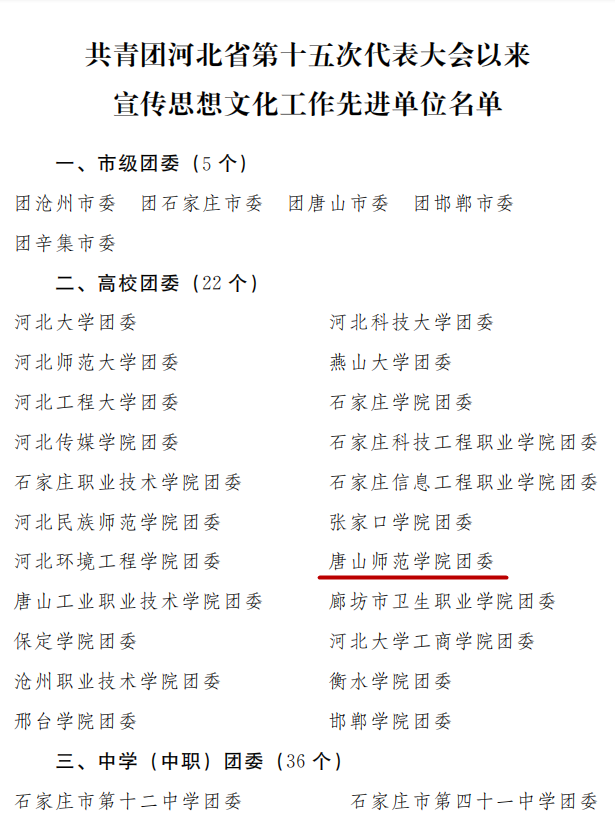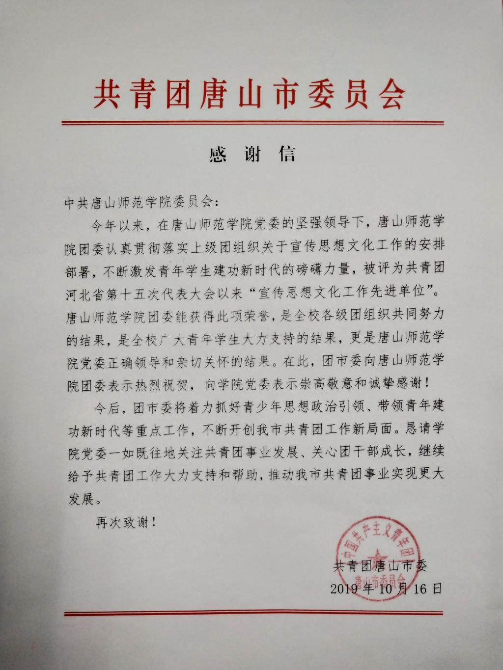 beat365团委荣获河北省共青团“团省十五大以来宣传思想文化工作先进单位”称号,共青团唐山市委向学校发来了感谢信。