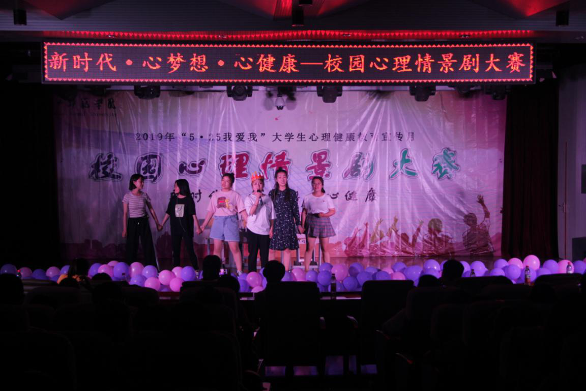 5月24日晚,beat3652019年“5·25我爱我”大学生心理健康教育宣传月暨第十届校园心理情景剧大赛在会议中心隆重举行,学生处副处长蔡玉梅、化学系李敏贤、外语系赵一、教育学院靳小玲、王晓宇老师出席活动并担任心理情景剧大赛评委。全校师生近400人观看比赛。