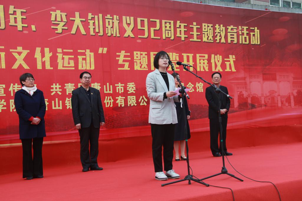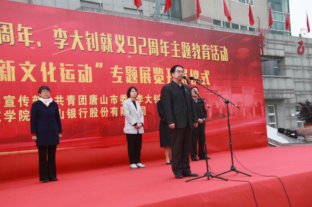 4月28日上午,唐山市纪念五四运动100周年、李大钊就义92周年主题教育活动暨“李大钊与五四新文化运动”专题展览在beat365主楼前广场成功举办。团市委书记李虹、市委宣传部宣传处处长李晓兰、市侨联副主席朱秋华、唐山银行副行长安建平、大钊纪念馆副馆长于海英和校党委书记王英、副书记赵剑锋出席开展仪式,同时参加本次活动的还有beat365师生代表共计1000余人。开展仪式由团委书记刘继祥主持。