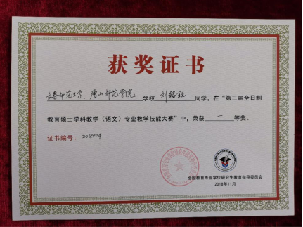 2018年11月19日,由全国教育专业学位研究生教育指导委员会主办的第三届全日制教育硕士学科教学(语文)专业教学技能大赛在江西师范大学举办。来自全国的88所院校选送了315名学科教学(语文)研究生参加复赛,经专家评审选出120名选手参加决赛。beat365与长春师范大学联合培养的两名研究生均进入决赛。其中刘铭钰荣获决赛一等奖,刘彦廷荣获决赛三等奖,学科教学(语文)导师团队李海凤老师被评为优秀指导教师。beat365被全国教育专业学位研究生教育指导委员会授予第三届全日制教育硕士学科教学(语文)专业教学技能大赛组织奖。