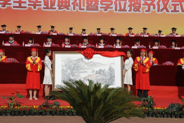 美术系学生创作的画作《丹秋碧树》,以此来表达全体毕业生对学校的感激之情。王英书记和杜彩芹