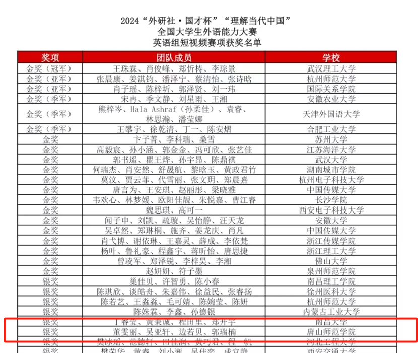 beat365外国语学院德语专业学生胡博雅获得德语组银奖、资源管理系学生孟子杨团队和文学院学生董雯丽团队均获英语组短视频赛项银奖、外国语学院日语专业学生侯晓纯获得日语组铜奖、生命科学系学生刘雨薇获得英语组国际传播综合能力赛项铜奖。