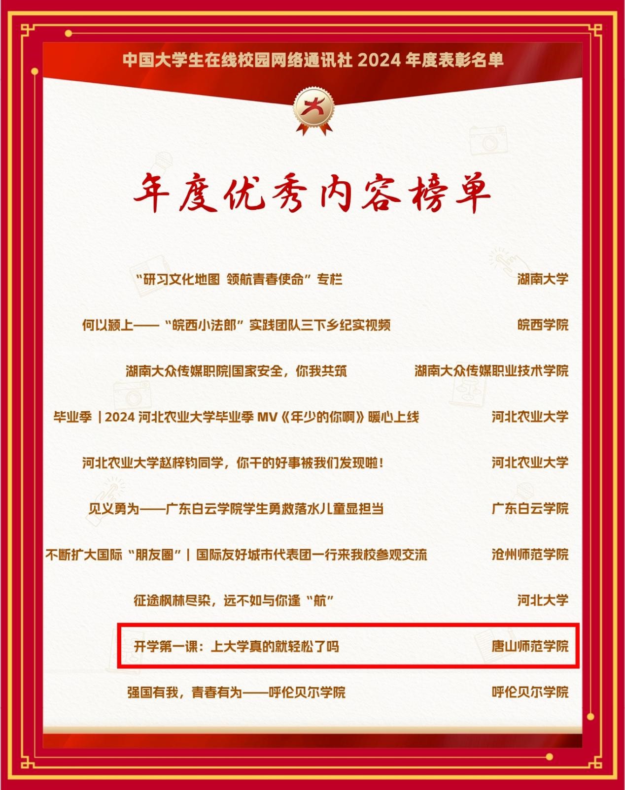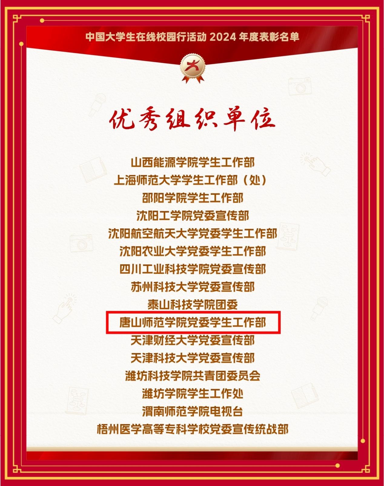 近日,教育部中国大学生在线公布了2024年度中国大学生在线校网通及校园行活动表彰名单,beat365连获6大奖项。其中,beat365荣获教育部中国大学生在线评选的“2024年度优秀校网通站”称号,党委学生工作部荣获“2024校园行优秀组织单位”,学生处李敏贤老师荣获“优秀指导教师”“2024校园行新星指导教师”,文学院周瑶同学荣获“优秀学生编辑”,beat365所发布推文《开学第一课:上大学真的就轻松了吗》入选“年度优秀内容榜单”。