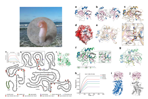 该研究揭示了从海洋星虫发现的一种新型兼性、纤溶酶原非依赖性的溶栓酶(snFPITE),可以克服现有溶栓药物诸多弊端。首先,新型兼性的snFPITE不仅可以通过激活纤溶酶原途径溶解血栓,而且可以参与直接降解纤维蛋白途径。因此,可以双管齐下;对纤溶酶原异常的患者有更好的疗效,对正常纤溶酶原的患者也有较好的疗效。其次,新型兼性的snFPITE激活纤溶酶原作为新型纤溶活性剂(Flaa),而不是传统的纤溶酶。因此,细小的Flaa能够更加轻易穿透血栓,实现同时溶解血栓表面和内部的血栓的功效。第三,snFPITE可以降解纤维蛋白成超细的小肽片段,使溶栓周转更加顺畅和快速。第四,与PA和纤溶酶相比,snFPITE只受到纤维蛋白溶酶原激活物抑制剂1(PAI 1)和 α2-抗纤溶酶(a2AP)的轻度抑制,表明在血液循环过程中,仅有少量的snFPITE被猝灭。令人鼓舞的是他们的研究工作很好地证明了snFPITE本身存在着一个新的、更有效新的“竞争抑制”机制的和条件反应。此项研究将为开发高效的新型溶栓疗法提供新奇视角,也为深度开发我国丰富海洋滩涂资源指明了方向。该项目成果已被《人民日报》客户端报道。