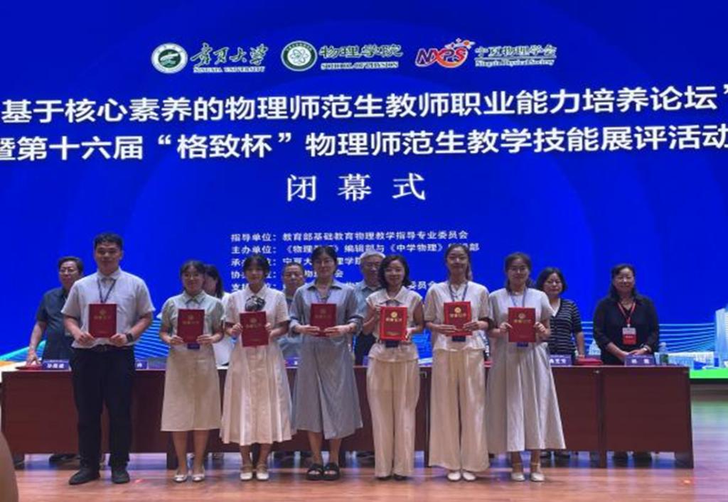 近日,由教育部基础教育物理教学指导专业委员会指导,《物理教师》编辑部与《中学物理》编辑部主办,宁夏大学承办的“基于核心素养的物理师范生教师职业能力培养论坛”暨第十六届“格致杯”物理师范生教学技能展示与交流活动圆满落幕。物理科学与技术学院参赛团队在此次活动中表现优异,共斩获7项国家级荣誉,其中自制教具展评一等奖一项、二等奖两项;物理教学技能展示一等奖一项、二等奖三项,成果丰硕。