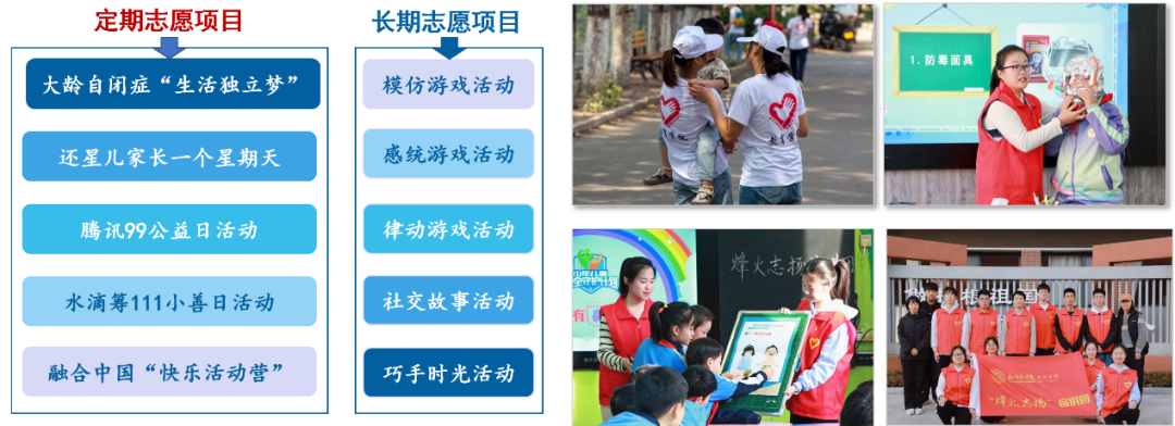 一是以品牌志愿服务涵养教育情怀。学院组织实施“一专业一特色”志愿项目工程,建立“长期志愿服务+定期志愿服务”的组织模式,形成了以“青影在线——自闭症陪伴式教育干预服务”“点亮一盏灯,照亮一个家——残障儿童菁菁校园融合项目”等为核心的“以爱助人”志愿服务板块;以“心理辅导公益活动”“农村务工子弟教育帮扶活动”等为核心的“以心暖人”志愿服务板块;和以“科技志愿服务”“爱国主义教育宣讲活动”“校园安全宣讲活动”等为核心的“以文化人”志愿服务板块。丰富多彩的志愿服务,引领学生以专业所学和服务回报社会,涵养深厚教育情怀和专业自信,获得良好社会反响,形成多层次传播矩阵。