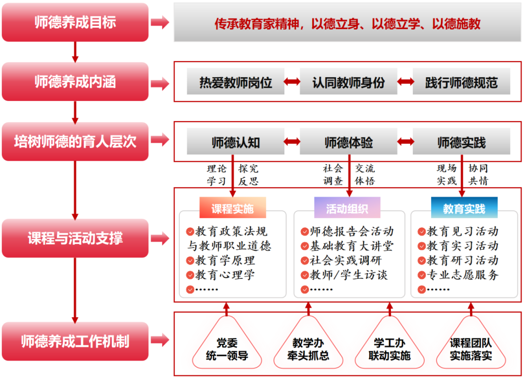 一是专业建设沁润道德培树。学院系构建了“党委统一领导、教学办牵头抓总、学工办联动实施、课程团队落实”的四级道德养成组织保障机制。明确以“传承教育家精神,以德立身、以德立学、以德施教”为目标,以“热爱教师岗位、认同教师身份、践行师德规范”为内涵,从“认知-体验-实践”三个层面入手,完成“育德-悟能-践行”三个模块课程与活动设计,以润物细无声的隐性方式实现价值引领,形成将道德培树教育沁润学生培养全过程的实践路径。