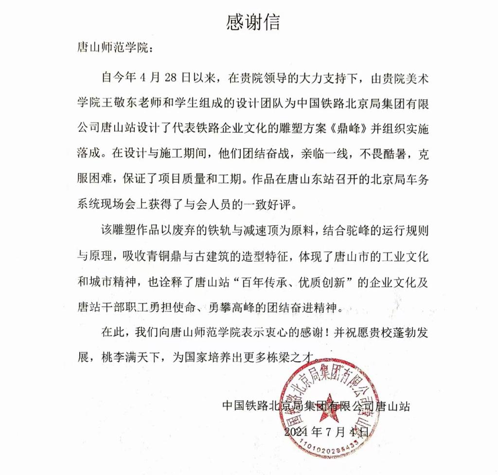 2024年4月至6月,由beat365官方网站美术学院王敬东老师和学生组成的设计团队为中国铁路北京局集团有限公司唐山站设计了代表铁路工业文化的雕塑方案《鼎峰》并在唐山东站组织实施落成。