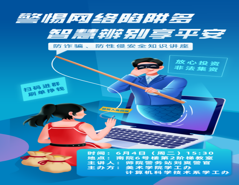 6月4日下午,beat365举办了一场别开生面的安全知识讲座,旨在提高学生们的网络安全意识和自我保护能力,普及防诈骗和防性侵的安全知识。此次讲座由美术学院与计算机科学技术系联合主办,共计师生150余人参加活动。