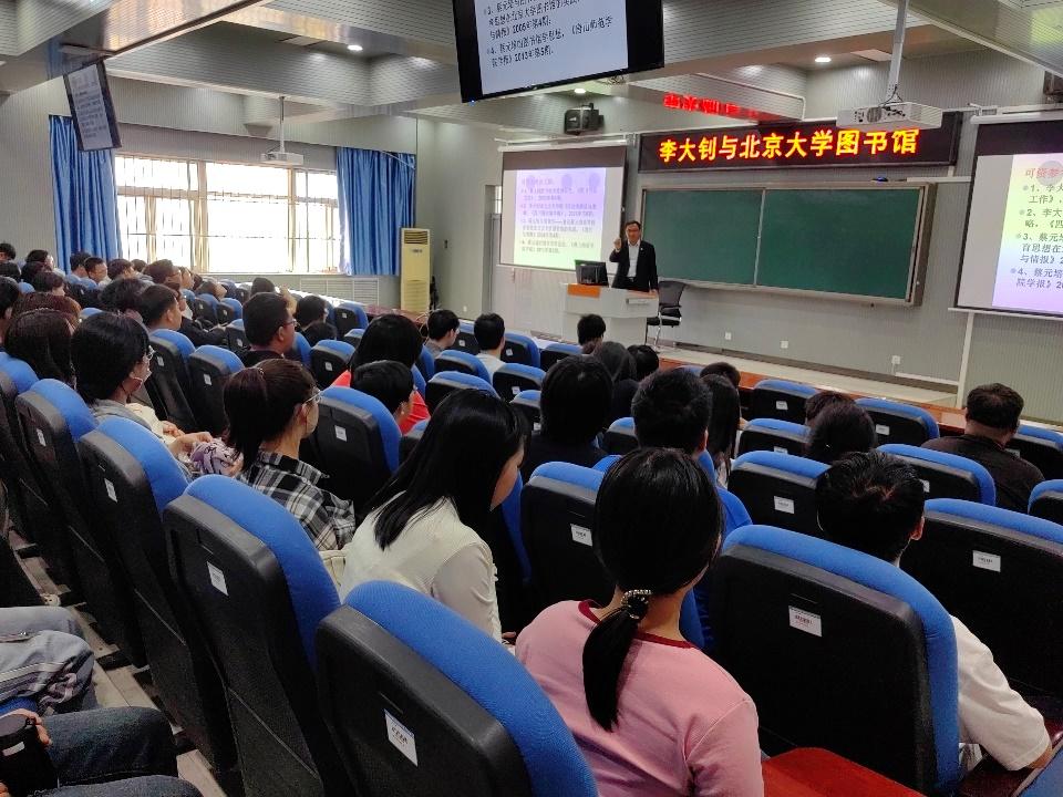 4月18日下午,读书节文化大讲堂在图书馆学术报告厅开讲,图书馆副馆长、中文系兼职教授周进良作题为《李大钊与北京大学图书馆》的主题讲座,历史文化与法学系学生150余人参加了讲座。