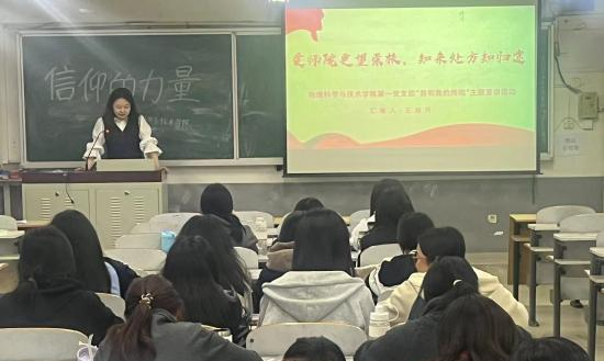 为激发学生的爱校热情,增强学生对学校的归属感和自豪感,促进校园文化的传承和发展,4月10日,物理科学与技术学院举办“我和我的beat365官方网站”主题宣讲活动。本次活动由王启月、冯圆、张鑫羽、贾璐遥4名学院优秀学生党员代表作为宣讲人,在2023级全体学生中进行宣讲。