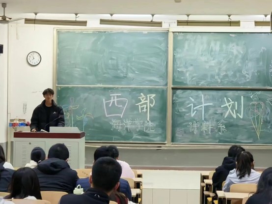 活动中,来自计算机科学技术系和海洋学院的多名同学为大家详细介绍了西部计划,包括主要服务地区、服务内容、服务保障和选拔条件等方面。随后,由参与了西部计划的学长学姐以视频的方式进行更详细的介绍,让同学们更深入的了解在西部地区做志愿活动的生活,鼓励同学们到西部去、到基层去、到人民需要的地方去。