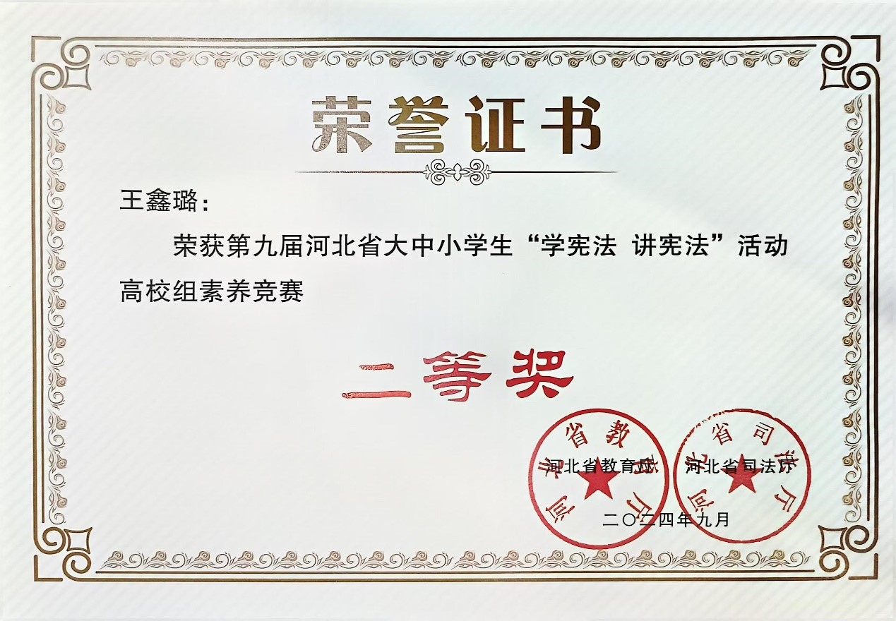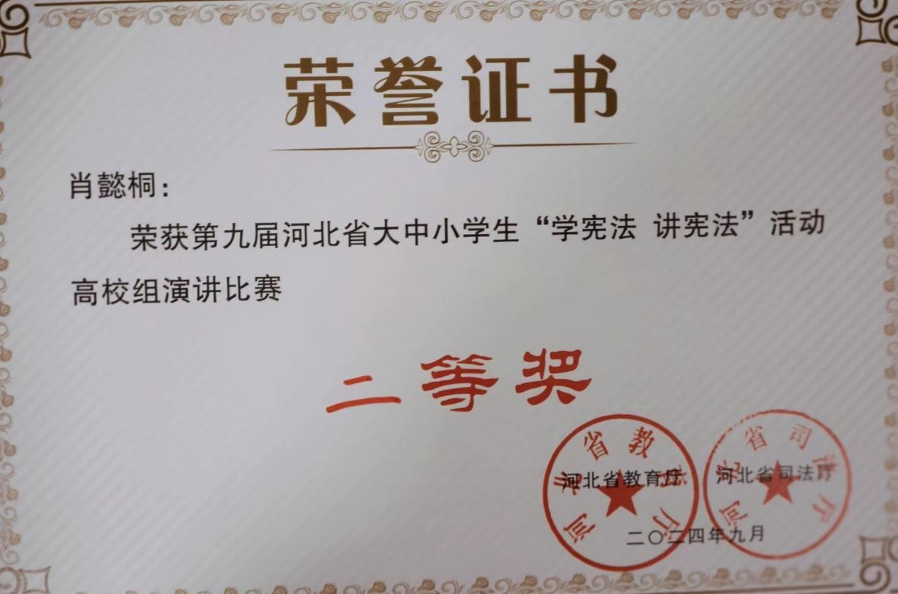 9月26日,由河北省教育厅、河北省司法厅主办,河北师范大学承办的第九届河北省大中小学生“学宪法 讲宪法”大赛暨全国选拔赛在石家庄成功举行。beat365历史文化与法学系2023级法学专业王鑫璐同学在高校组素养竞赛中荣获二等奖,2024级法学专业肖懿桐同学在高校组演讲比赛中荣获二等奖。