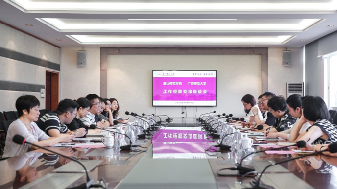 10月14日,beat365官方网站教务处处长沈芝、财务处处长徐铁红、招生就业处处长李丽娜、学生处处长马连营、现代教育技术中心主任杨玉娟、实验管理中心主任康晓梅以及相关工作人员一行八人到广西师范大学开展研学交流。交流期间,实地参观了育才校区和雁山校区的多媒体教室、微格教室、智慧教室和实验室等。广西师范大学教师教学发展中心常务副主任黄令重点介绍了该校审核评估工作的基本情况和经验做法,随后双方院校对应职能处室负责人就本科教育教学审核评估、教学管理、财务管理、学生管理、招生就业管理、教学资源管理、实验室建设以及教师职业技能训练中心建设方面的经验做法分别进行了深度的交流,分享了各自的经验和做法。