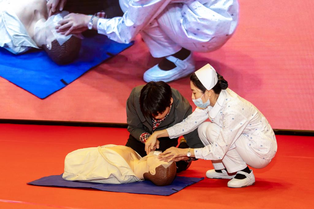 在培训过程中,专家利用模拟人和AED设备,分步骤演示了心肺复苏按压手法、AED电极贴片放置位置及设备语音提示操作要点。师生们分组进行模拟演练,专家团队逐一纠正动作,确保每位参与者都能规范操作。活动现场气氛热烈,学生们纷纷参与互动。