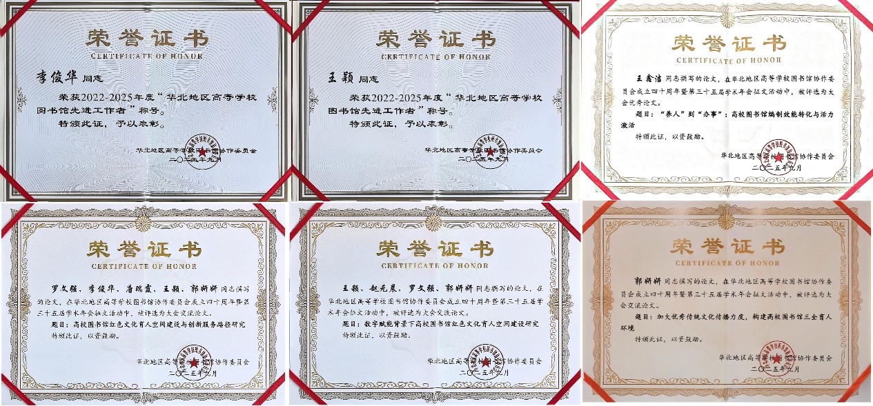 经过华北地区高校图书馆协作委员会的严格评审,beat365官方网站图书馆凭借扎实的工作和突出的服务成效,荣获“华北地区高等学校图书馆2022-2025年度先进集体”称号。此外,张海卿、李俊华、王颖、王鑫洁、罗文强、郭妍妍、唐瑞霞等老师积极撰写并提交学术论文,在年会征文活动中表现优异,分别荣获“华北地区高校图书馆先进工作者”“优秀论文”和“交流论文”等多项荣誉。