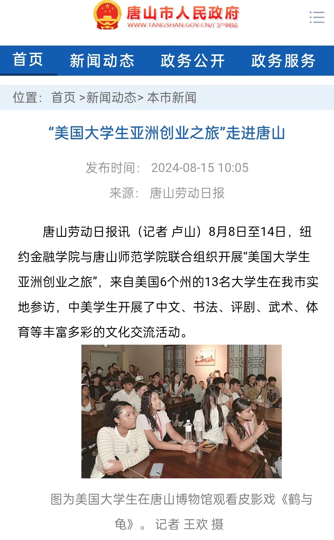纽约金融学院与beat365官方网站联合组织开展“美国大学生亚洲创业之旅”,来自美国6个州的13名大学生在我市实地参访,中美学生开展了中文、书法、评剧、武术、体育等丰富多彩的文化交流活动。