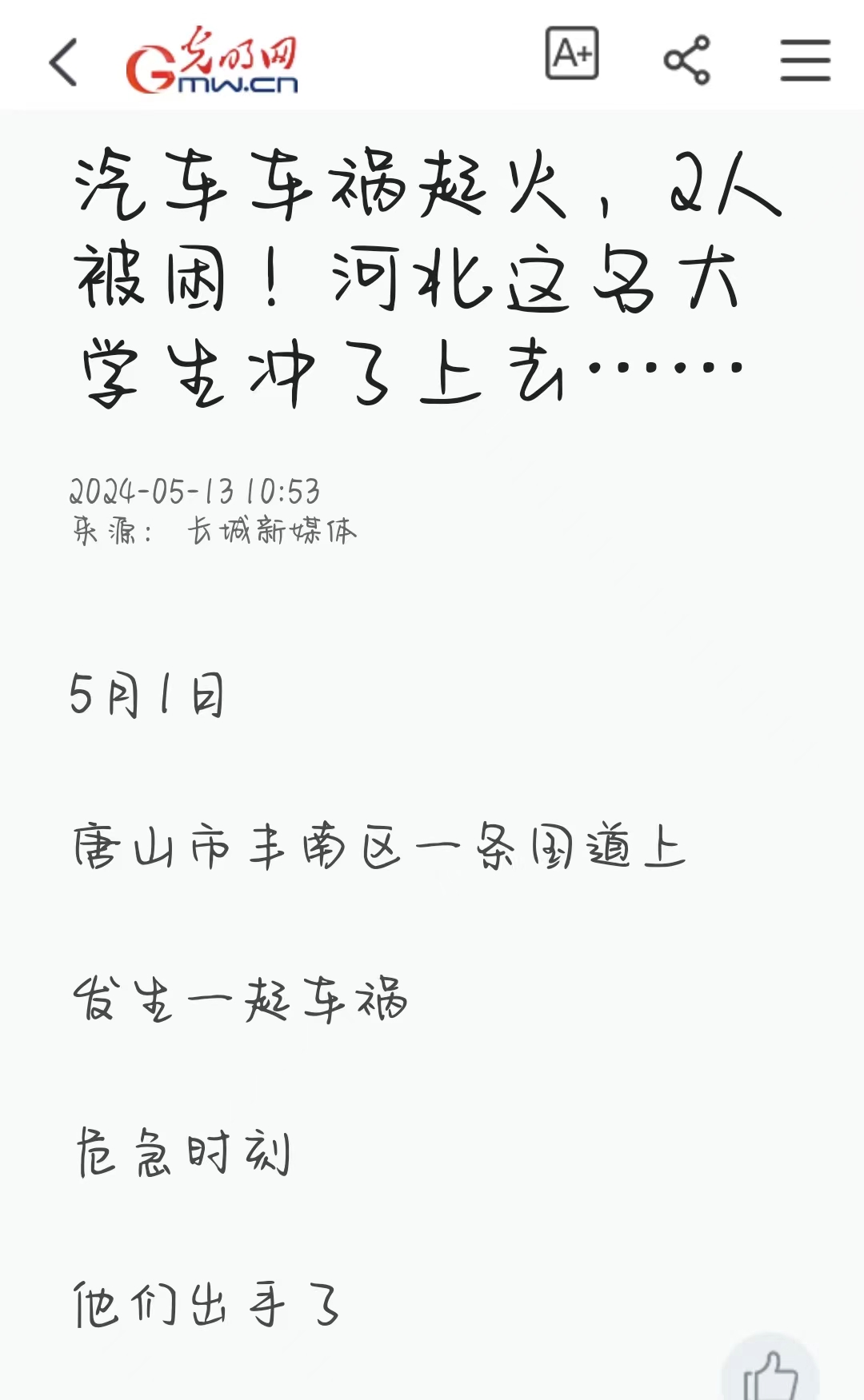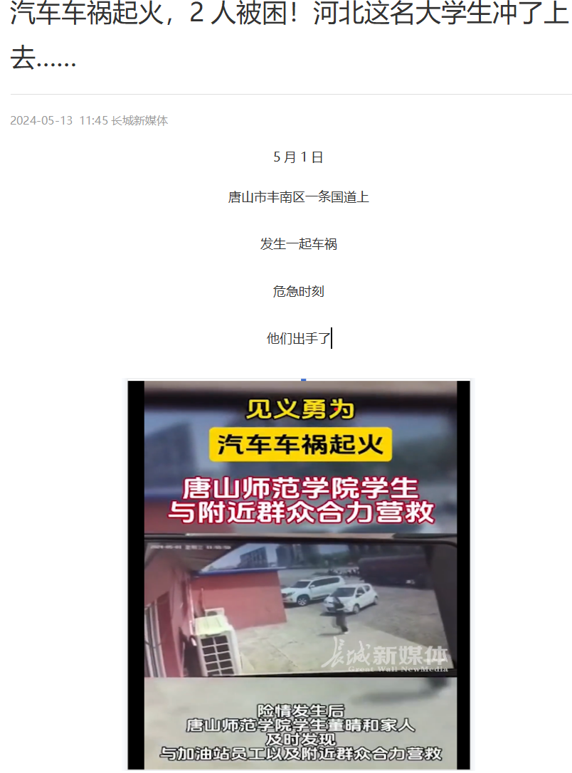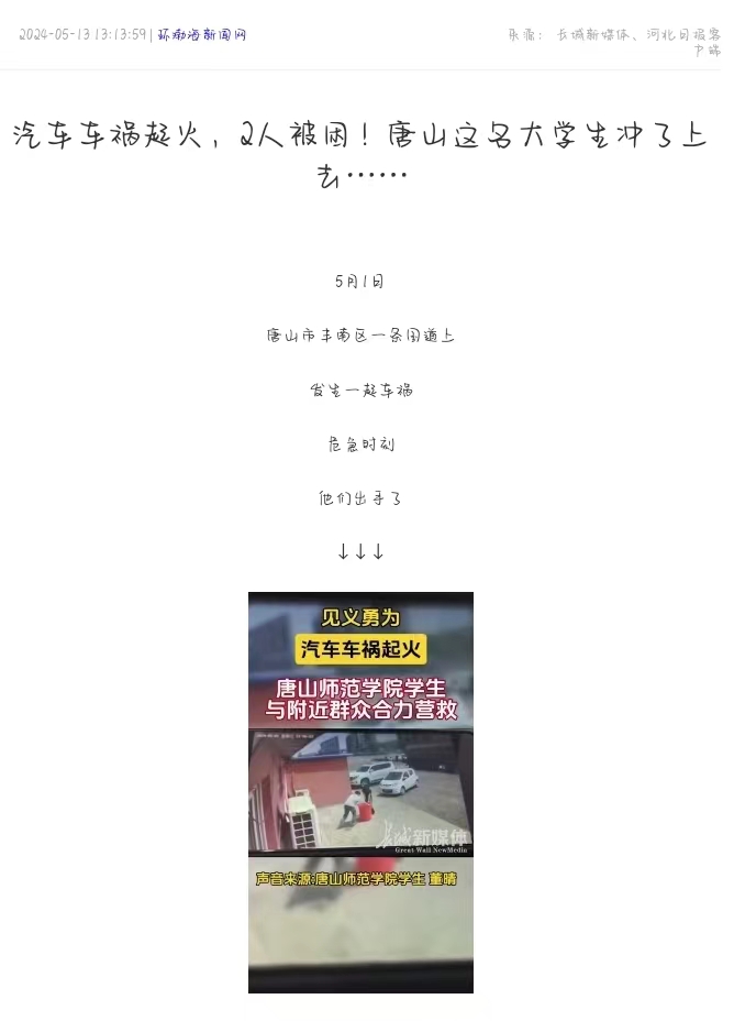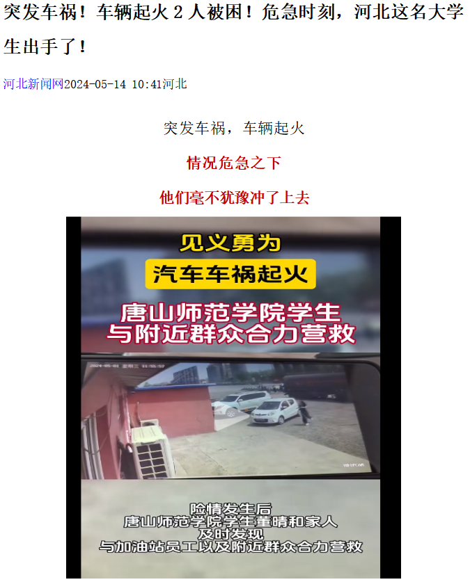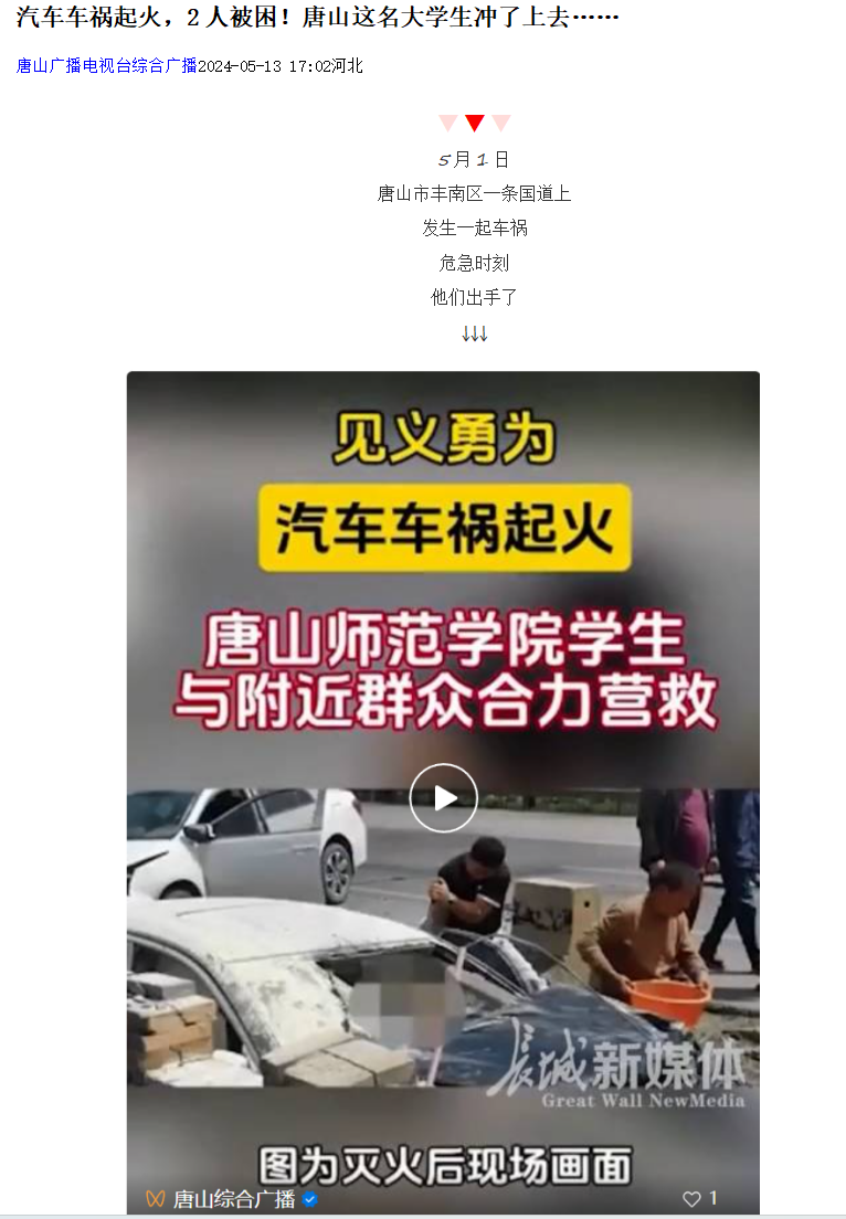 5月1日唐山市丰南区一条国道上发生一起车祸,危急时刻beat365官方网站董晴和家人及饭店顾客齐心协力救援出被困的2人。危急时刻,不惧危险伸出援助之手。董晴,为你点赞!此事件被光明网,河北日报客户端,唐山广播电视台综合广播等媒体纷纷报道。