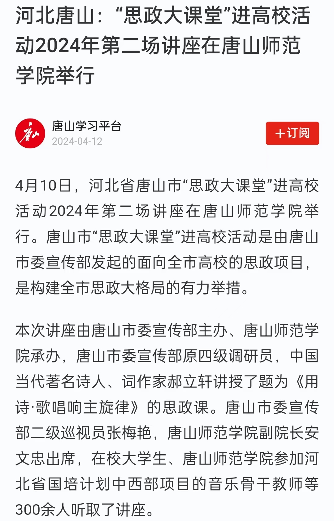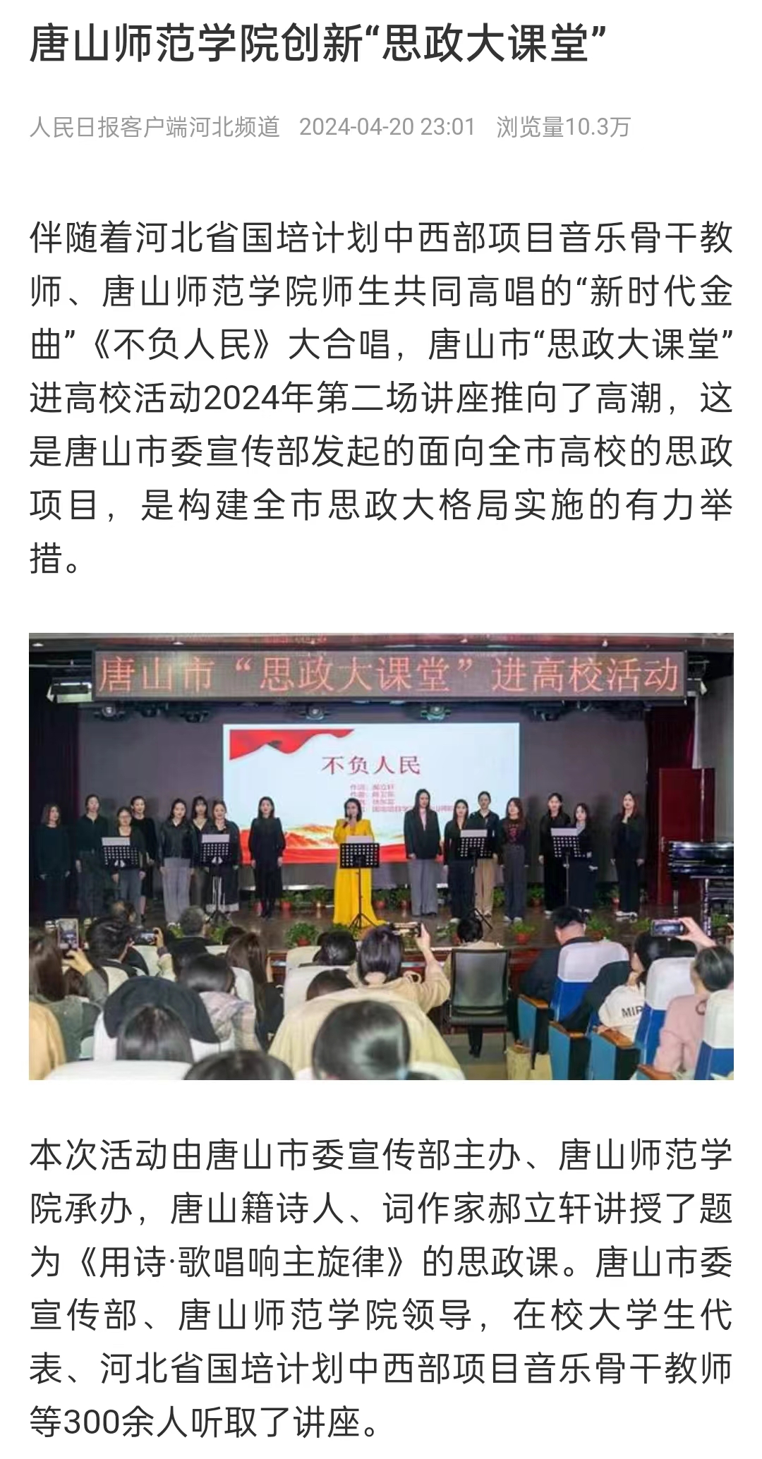 伴随着河北省国培计划中西部项目音乐骨干教师、beat365官方网站师生共同高唱的“新时代金曲”《不负人民》大合唱,唐山市“思政大课堂”进高校活动2024年第二场讲座推向了高潮,这是唐山市委宣传部发起的面向全市高校的思政项目,是构建全市思政大格局实施的有力举措。