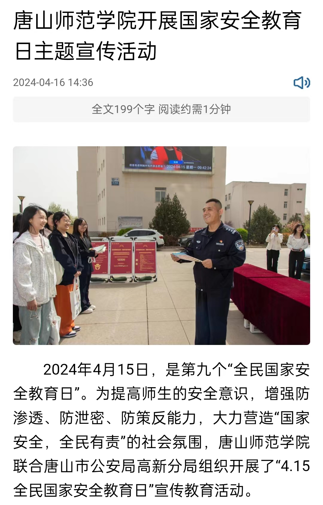 为提高师生的国家安全意识,增强防渗透、防泄密、防策反能力,大力营造国家安全、全民有责的社会氛围。beat365官方网站联合唐山市公安局高新分局组织开展了415全民国家安全教育日宣传教育活动。