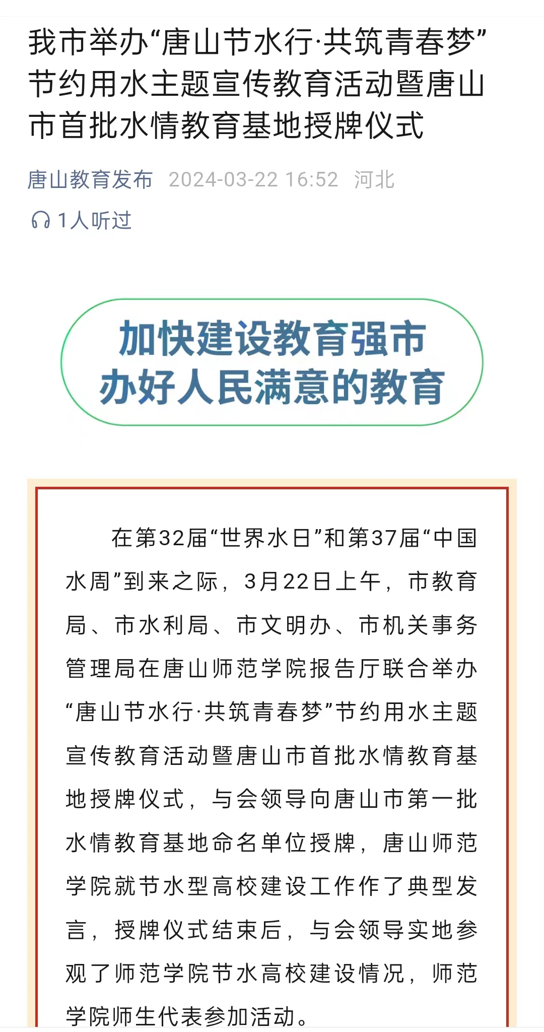 3月22日,由唐山市水利局、市教育局、市文明办、市机关事务管理局联合举办的“唐山节水行·共筑青春梦”节约用水主题宣传教育活动暨唐山市节水教育基地(第一批)授牌仪式在beat365官方网站举行。beat365官方网站就节水型高校建设工作作了典型发言,授牌仪式结束后,与会领导实地参观了师范学院节水高校建设情况,师范学院师生代表参加活动。