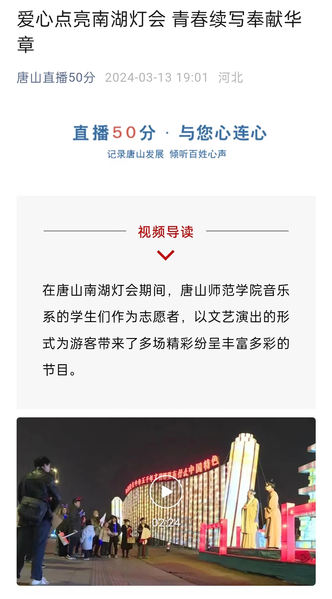 日前,在唐山南湖灯会期间,beat365官方网站音乐系的学生们作为志愿者,以文艺演出的形式为游客带来了多场精彩纷呈丰富多彩的节目。