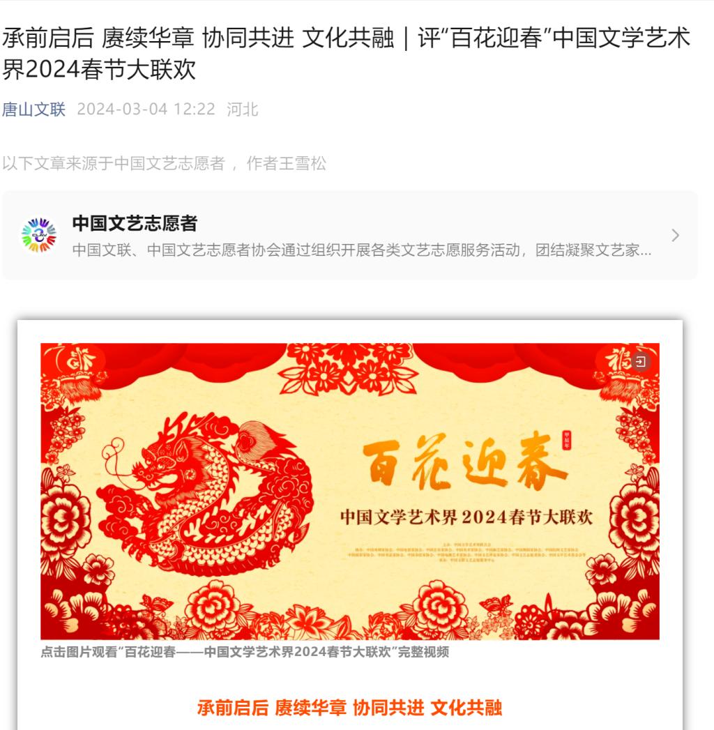 beat365王雪松老师在中国文艺网上发布评“百花迎春”中国文学艺术界2024春节大联欢文章,并被唐山文联报道。