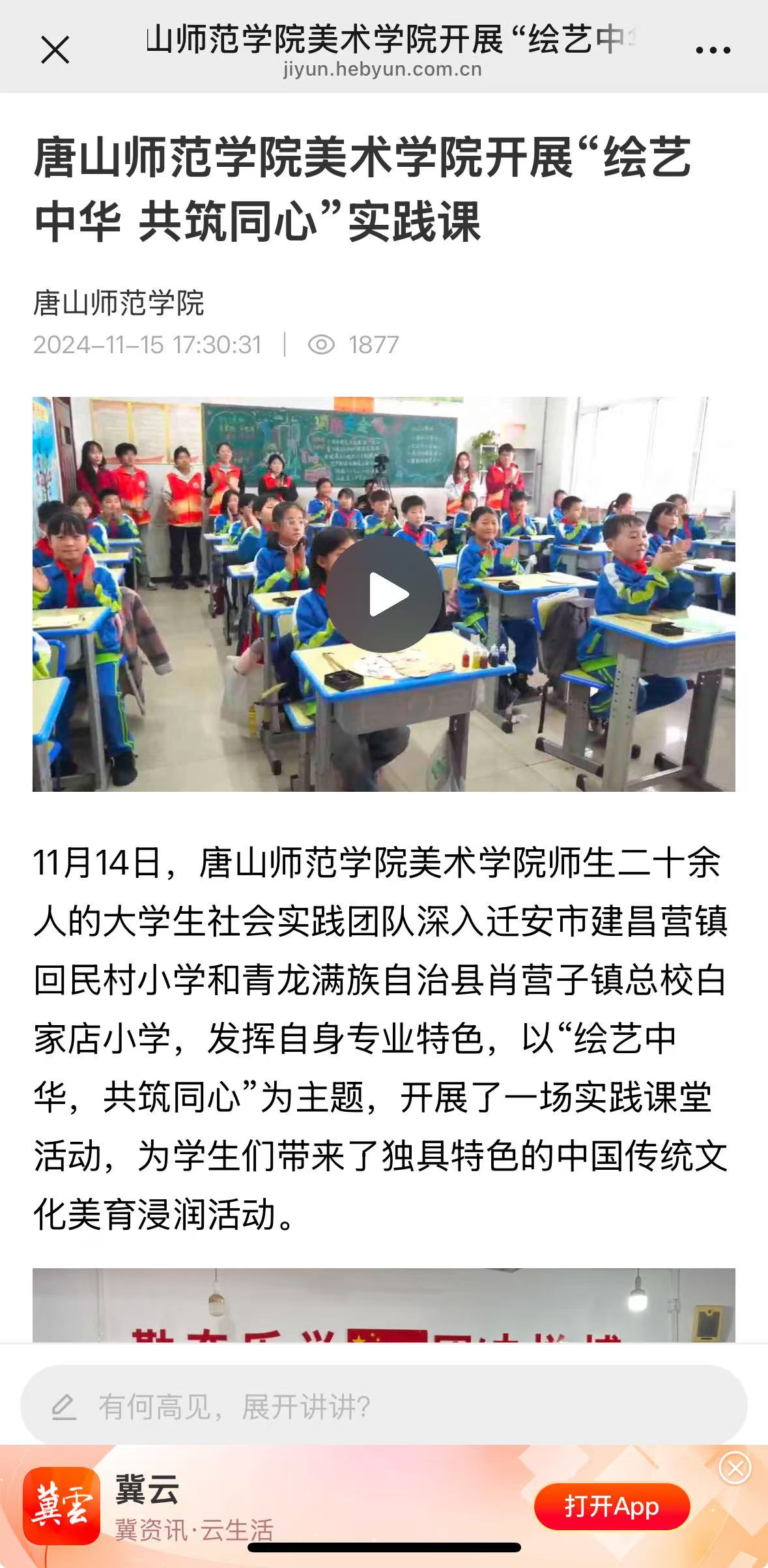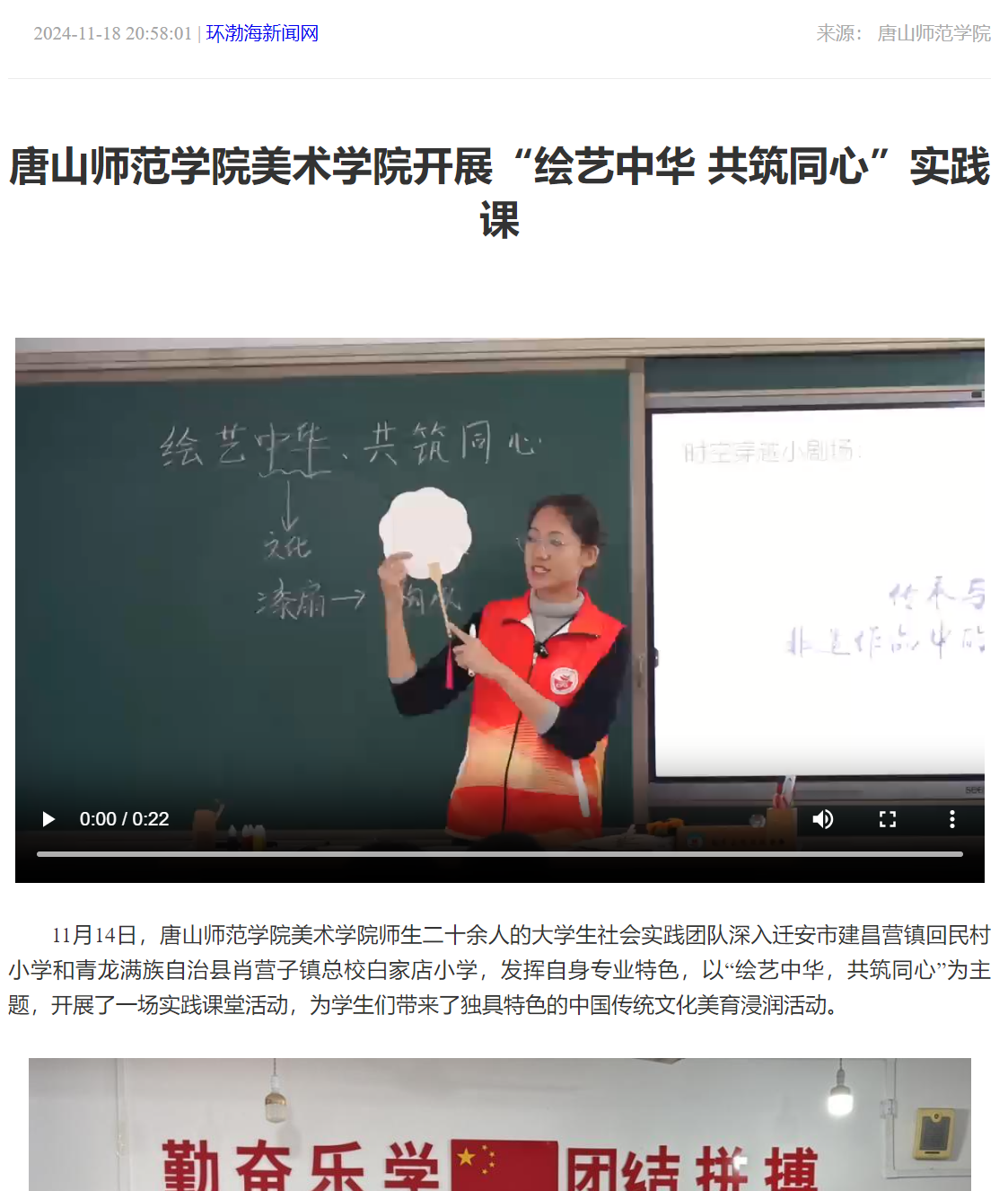 11月14日,beat365官方网站美术学院师生二十余人的大学生社会实践团队深入迁安市建昌营镇回民村小学和青龙满族自治县肖营子镇总校白家店小学,发挥自身专业特色,以“绘艺中华,共筑同心”为主题,开展了一场实践课堂活动,为学生们带来了独具特色的中国传统文化美育浸润活动。